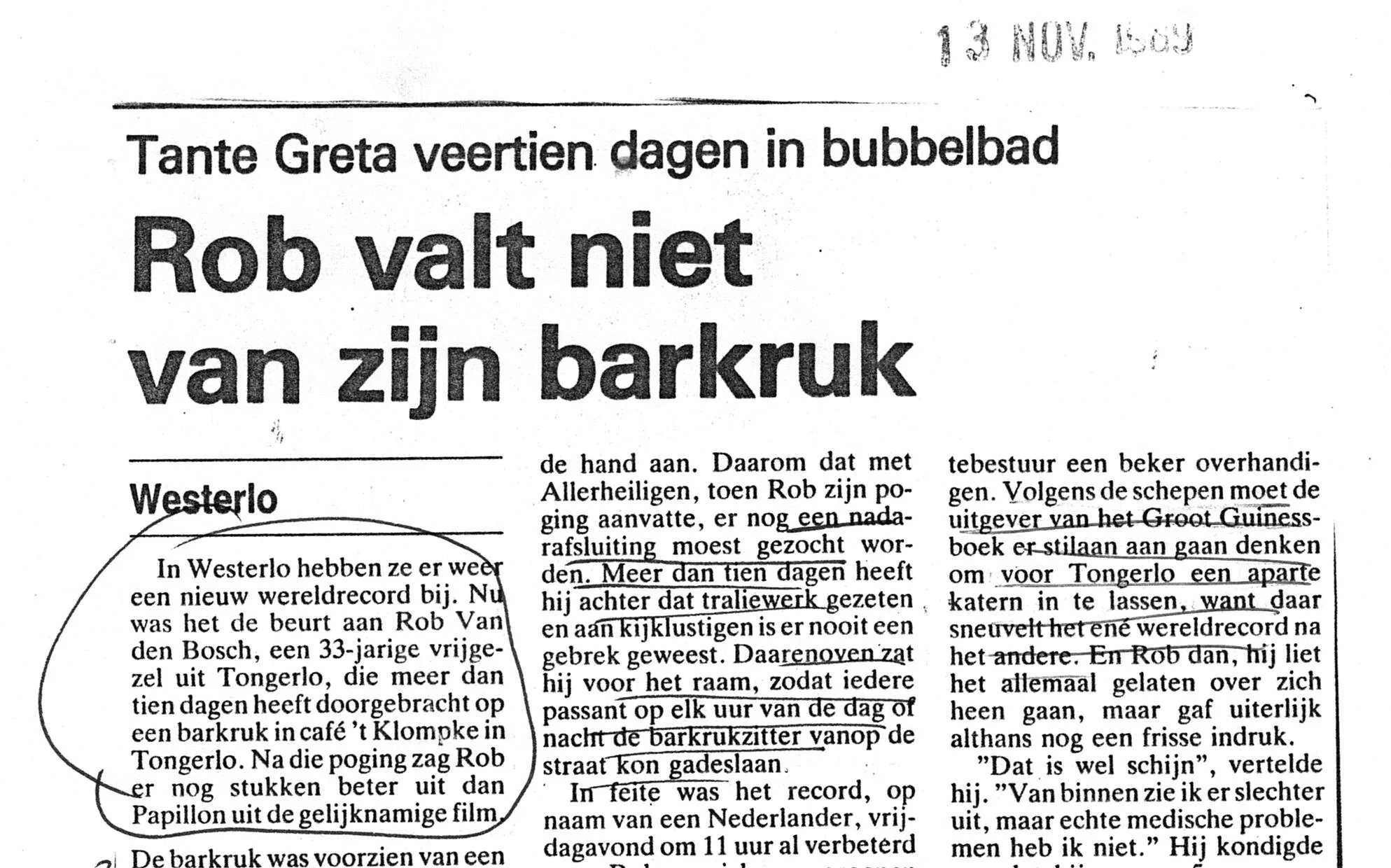 In november 1989 bracht de nu 39-jarige Rob Van den Bosch uit Westerlo het Guinnessrecord barkrukzitten op 245 uren. In café 't Klompke in Tongerlo heeft hij dus meer dan tien dagen op een barkruk gezeten met alleen een rugleuning om tegen te steunen, maar verder geen tafel, geen toog, geen schouder om op te leunen. Tot u spreekt een stevig zitvlak.